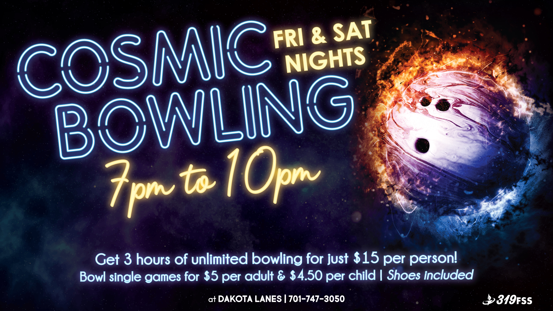 Get 3 hours of unlimited cosmic bowling every Friday & Saturday night for just $15 per person!